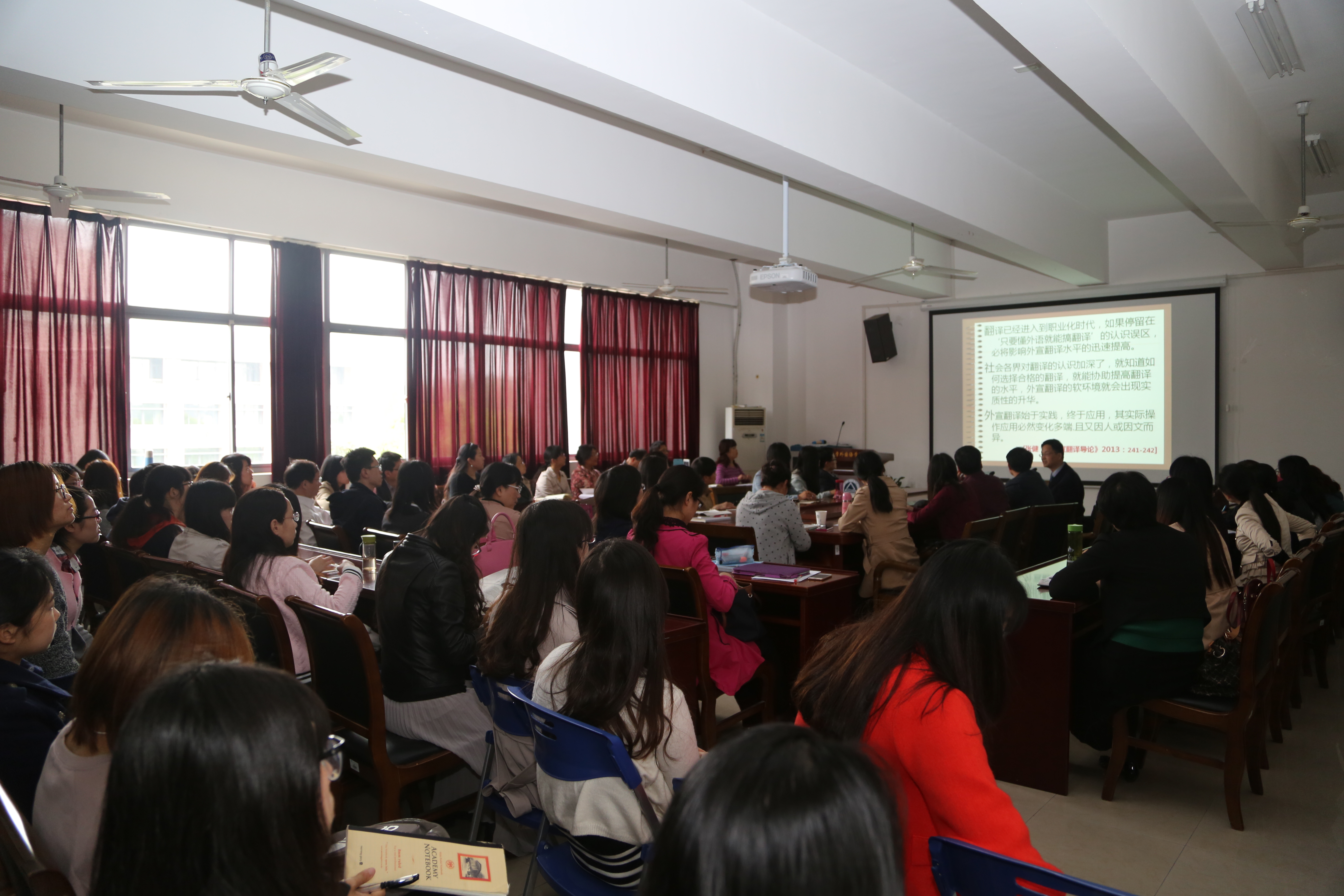 4月27日下午,开云手机登录入口A349会议室座无虚席。上海外国语大学博士生导师张健教授应邀为我院师生作题为《走出外宣翻译的误区》的精彩讲座,讲座由开云手机登录入口翻译团队负责人王金安教授主持。开云手机登录入口翻译团队全体教师、英语系全体教师、大学外语拓展部与基础部部分教师与部分研究生聆听了讲座。本次讲座还有来自无锡市外办、无锡市翻译协会、无锡太湖学院的部分教师参加。