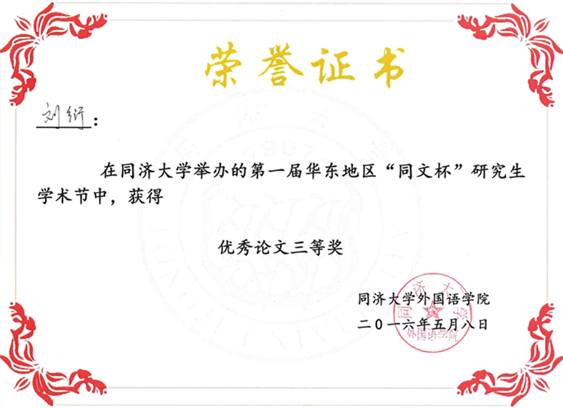 2016年5月8日,第一届华东地区“同文杯”研究生学术节在同济大学开云手机登录入口同文楼隆重举行。来自全国26所高校的上百名研究生济济一堂、共飨学术盛宴,围绕“国际视野与中国语境观照下的外国语言文学研究”这一主题,在语言学、文学和翻译等研究领域进行了充分交流。本次学术节共收到来自北京大学、中国人民大学、复旦大学、同济大学、中南大学、华东师范大学、上海外国语大学以及江南大学等26所高校的博士和硕士研究生投稿论文105 篇。我院方文开教授指导的2014级硕士研究生刘衍携论文参加了此次学术节。