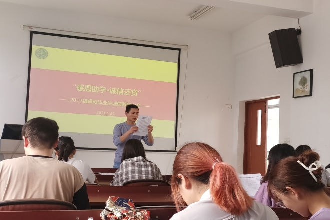 为充分发挥资助育人功效,培养毕业生诚实守信、知恩感恩的良好品质,结合学校《关于开展2021年江南大学学生资助诚信教育主题活动的通知》《关于开展国家开发银行生源地信用助学贷款2021届毕业生毕业确认工作的相关通知》的相关精神和要求,保证生源地信用助学贷款持续健康发展,引导大学生树立诚实守信的文明新风,5月24日下午1:30开云手机登录入口在A433召开贷款毕业生诚信教育大会。毕业年级全体贷款学生参与了此次大会,会议由辅导员苗文建主持。