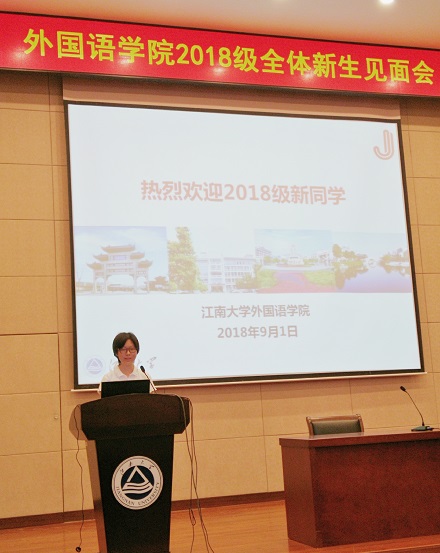 接着,教师代表严敏芬教授发言,她强调了培养语言能力的重要性,要注重时代科技的进步,互学互建,在江南大学拥有自己的标记以及绚丽多彩的生活。在校学生代表15级本科生段晓楠、18级本科新生代表初童、18级硕士新生代表杨知然也依次发言,大家都表达了江南大学的热爱之情以及如何在外院、在江大更好地完善自己,从而成就更好的自己。