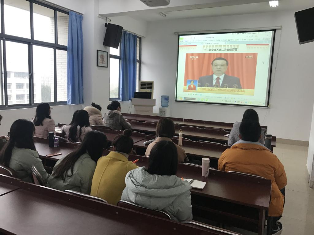 2019年3月5日上午,十三届全国人大二次会议在北京隆重召开。为引导学生关注“两会”召开盛况,增强学生社会意识,开云手机登录入口组织各学生党支部学生党员在学院A433集体收看“两会”直播视频。学院分团委辅导员老师黄颖、张圆也和同学们一起收看直播,学习“两会”精神。