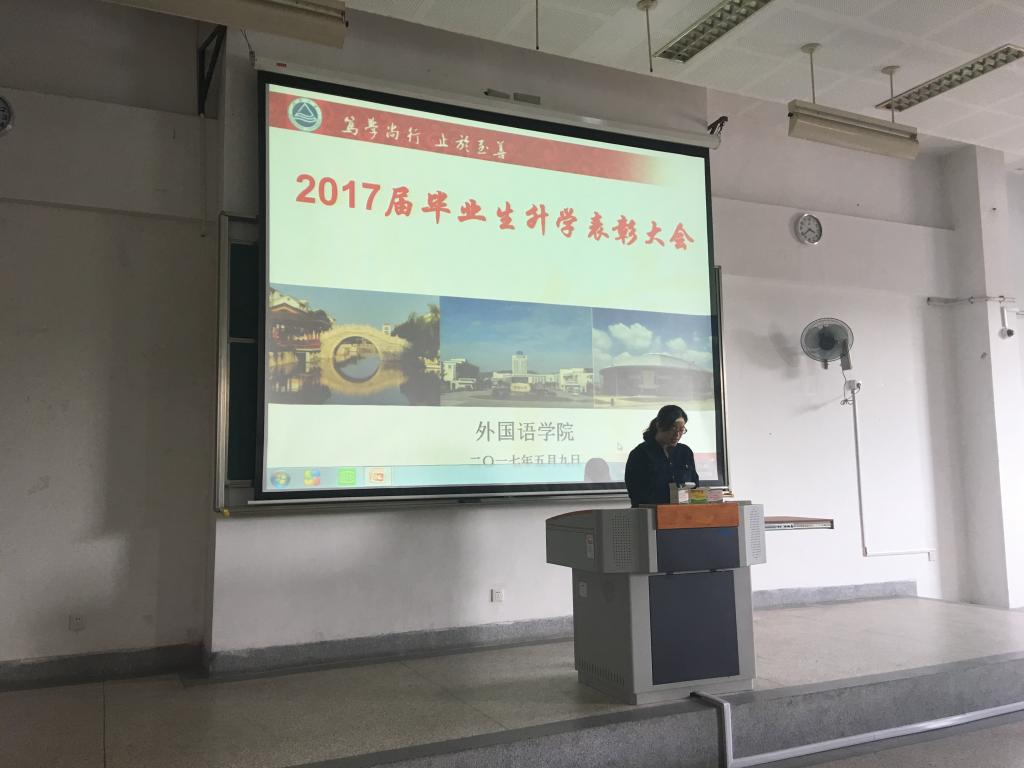 2017年5月9日,开云手机登录入口2017届学生升学表彰大会暨升学经验分享会在2A127教室召开。院党委黄城芳书记、英语系李学宁主任、日语系崔明姬主任、辅导员刘琦老师等应邀出席会议。会议由钱薇薇老师主持。