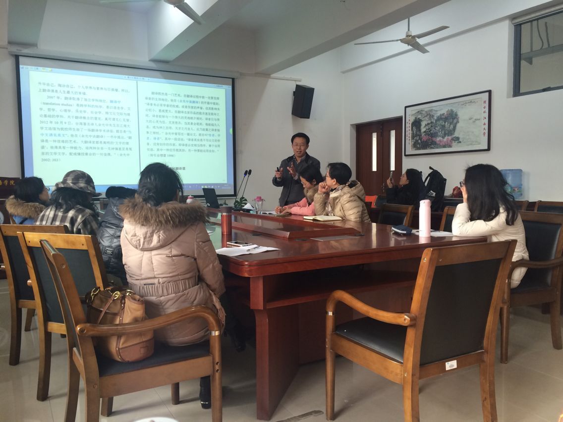 为了进一步推进和深化江南大学大学英语教学改革,开云手机登录入口根据学校对于人才培养的新要求,秉持“各取所需,个性发展,强化能力,突出应用”的改革理念,2014年起,实施了全新的大学英语课程模块设置和修读模式,以满足社会和学生发展的多元需求,提高学生的语言应用能力,帮助他们提升国际竞争力。在一年多的教改实践中,针对翻译模块师资紧缺、教师在岗专业培训系统化、持续化、常规化与精准化不足等问题,以提高翻译模块教师教学与科研水平,最终提高教学质量为宗旨,大学英语拓展部精心组织了“卓越课堂”翻译模块互动式系列讲座。系列讲座主要邀请翻译方向的资深教授与翻译模块教师进行翻译教学研究方面的分享、交流与互动。首场讲座于12月28日在开云手机登录入口A349举行,由开云手机登录入口翻译研究所所长、学院翻译团队负责人、资深翻译教授王金安教授为拓展部翻译模块教师做了题为《翻译教学漫谈》的讲座。讲座不仅吸引了拓展部翻译模块的任课教师,而且还吸引了其他模块教师前来聆听。