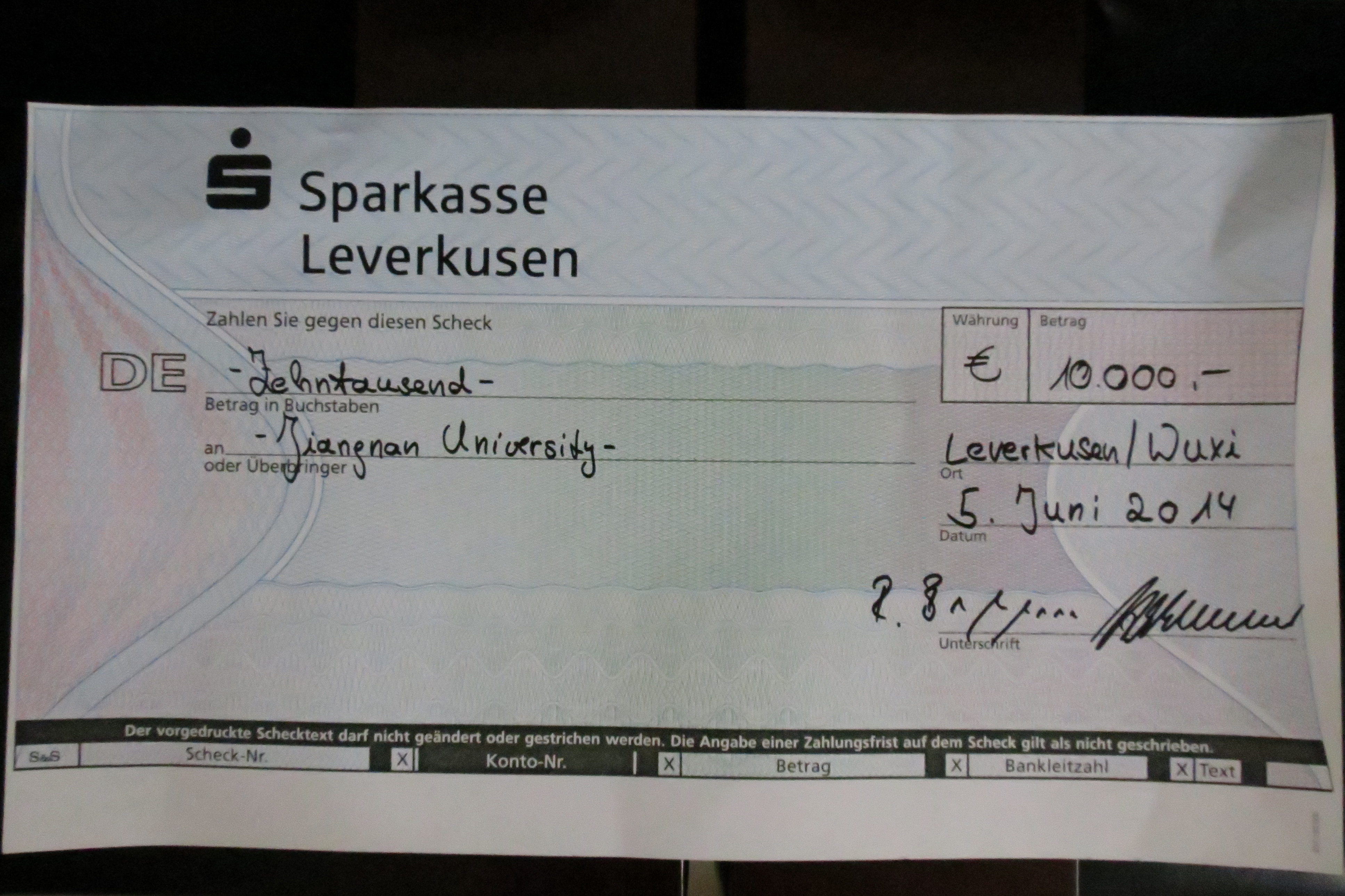 2014年6月5日,由市长莱茵哈德·博鸿(Reinhard Buchhorn)率领的德国勒沃库森市政府和企业家代表团一行到访无锡,与无锡市续签友城协议。省委常委、市委书记黄莉新、市领导张叶飞、嵇克俭在无锡市市民中心一号楼会见了德国客人。勒沃库森市代表团此次来锡访问,意在推进两市教育界的交流合作,促进两地企业之间的经贸往来。在友城协议续签仪式上,勒沃库森市代表团主要成员之一勒沃库森储蓄银行董事会主席首席执行官曼弗雷德·赫博斯海姆(Manfred Herpolsheimer)先生以个人名义向江南大学外语学院捐赠教育交流经费1万欧元,用于江南大学开云手机登录入口师生开展奖教助学与国际文化交流,特别是与德国之间的交流与合作。江南大学开云手机登录入口龚晓斌院长代表受捐方从曼弗雷德·赫博斯海姆手中接过了捐赠支票和“伙伴关系”证书。此次捐赠活动得到了朗盛(无锡)化工有限公司和我院德语教师邢爱华的大力支持,特此致谢。