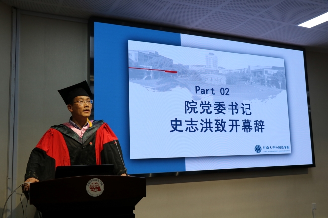 典礼伊始,学院党委书记史志洪致开幕辞。史志洪首先向全体毕业生们表达了热烈的祝贺和衷心的祝愿,并对同学们提出了殷切的期望。史志洪指出,今年的毕业季恰逢中国共产党成立100周年,在场的同学们都是实现第二个百年奋斗目标的建设者和见证者,希望大家无论应对何种困难,都要坚持心中有信仰;无论面对何种世态,都要保持胸中有情怀;无论未来身居何处,都要做到肩上有担当,用奋斗镌刻出最美的青春注脚。