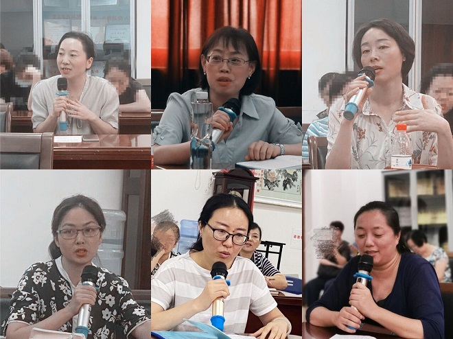 随后,教师们各抒己见,开展热烈的讨论。王伟炜老师分享了上学期开展全国大学英语课程思政示范课的经验,提出大学英语教师需提炼思政内容,有效设计教学活动;王筱娟老师从多年来潜心教学的经历出发,指出立德树人切实体现在教师言传身教和真心关爱学生的点点滴滴;仇黎霞老师介绍了基础英语课程组在每单元中融入思政元素的方法与途径;杨可炜老师描述了《听说(2)》课程如何将思政点融入学习内容的实例;许敏老师从务实创新的角度,讲述了教学资源素材收集中的思政关注点问题;辛洁敏老师分享了爱岗敬业就要保持工作热情并以这种热情感染学生、激发学习积极性的切身感受。