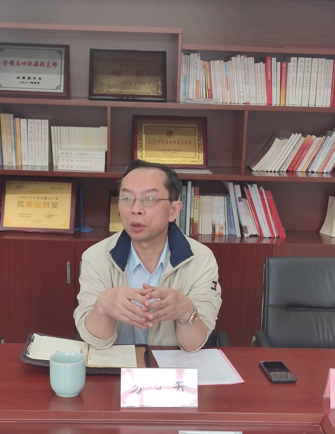 方文开对刘影一行来访表示热烈欢迎,并简要介绍了开云手机登录入口的历史沿革、学科建设、MTI申报以及大学英语教学发展与学习效果评价体系一体化平台等情况。