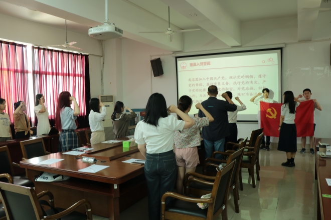 第二环节,全体毕业生党员右手握拳,在张梦兰同学的领誓下共同重温了入党誓词。全体党员在铿锵有力的宣誓声中再次擦亮入党初心,牢记作为一名共产党员的使命担当,立志将青春小我融入祖国大我中去,以奋斗姿态激扬青春。