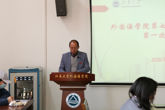 会议在庄严的国歌声中拉开帷幕。首先,由方文开院长代表学院行政做工作报告。方院长从人才与队伍建设、本科生培养与质量工程、研究生培养与学科建设、科学研究与社会服务等四个方面总结了学院过去三年中取得的成就和获得的荣誉,并总结了工作创新点、特色和主要经验,同时也针对学位点建设、团队建设和语种发展的空间等问题摆出了问题与不足。报告数据详实分析透彻,受到了与会代表的认可。