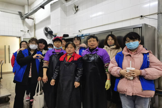 本次活动在三食堂和四食堂开展。进入食堂后,食堂负责人为大家分发了手套、围裙等。拿到自己的工具后,大家开始协助食堂阿姨进行工作。每个人各司其职,都在为食堂阿姨尽力分担一些,让她们在属于自己的节日里感受到我们的关心。午饭过后,食堂里前来就餐的学生渐渐少了,本次活动也要接近尾声了,随后大家与阿姨们合影留念道别。