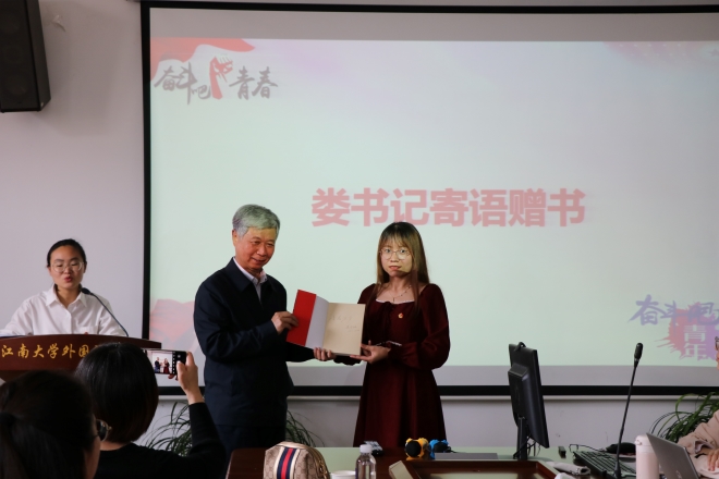 最后由娄国栋老师分享了自己的入党初心和故事。娄国栋老师自1973年3月5日入党,工作期间与青年为友,全心致力于学生工作。他强调了青年人的时代责任与历史使命,青年大学生要重视大学时期,将自己的初心和使命体现在日常的学习生活中。娄国栋老师说:本次团课可以激发学生们的内在动力,发展自我,奉献自我,发挥青年人的作用。“青春是人生最好的阶段,青春的精神应永远保留,青春万岁!”最后,娄国栋老师向英语1904团支部赠书《习近平的七年知青岁月》,让时代青年感受习近平总书记青春时代的力量。