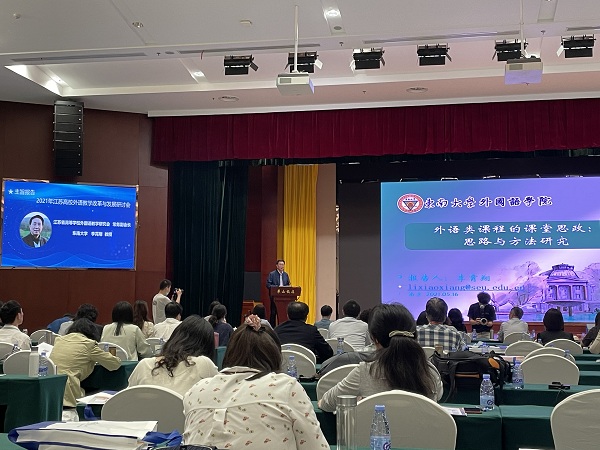 由江苏省高等学校外国语教学研究会与高等教育出版社主办的2021年江苏省高校外语教学改革与发展研讨会于5.15-16日在南京召开。本次研讨会以“大学外语教学中的课程思政融入”为主线,分别针对本科院校与高职院校的大学外语教学中如何推进课程思政教学改革进行了深入研讨。大会采用了专家发言、教师分享与互动交流的方式进行。我院朱义华、张效国与王伟炜老师参加了会议学习与研讨。