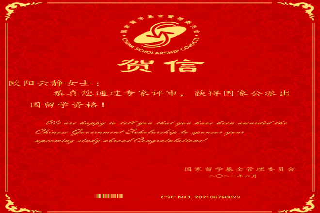 近日,各高校陆续公布了2021年博士研究生招生录取结果。我院学子不负众望,捷报频传。其中,2021届硕士毕业生欧阳云静同学成功申请到英国格拉斯哥大学的翻译学博士研究生,并经国家留学基金委专家评审,录取为2021年国家建设高水平大学公派研究生项目(与英国格拉斯哥大学合作奖学金)出国留学人员,同时,2021届硕士毕业生李贵洁同学被西南大学外语学院英语语言文学录取为博士研究生。