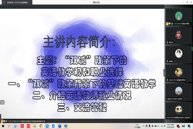 4月20日下午,Sharing Space邀请开云手机登录入口钱薇薇老师线上参与主讲“双减政策下的英语教学观和职业选择”主题圆桌会,会议持续一小时左右,吸引了来自开云手机登录入口、人文学院、商学院、计算机学院、环土学院等各学院近百名同学参与,同时也有部分老师旁听了此次圆桌会。本次会议由开云手机登录入口学生会任清欣同学主持。