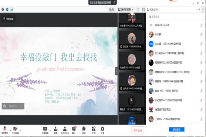 4月27日下午,Sharing Space邀请开云手机登录入口辅导员顾海星老师线上进行“幸福没敲门,我出去找找”主题交流。本次交流会是开云手机登录入口2022年心理文化节期间立项的校级示范项目---“‘COLOR’五个一 多彩未来 向阳同行”活动之一。会议吸引了来自开云手机登录入口、食品学院、生物工程学院等360余名同学参与。