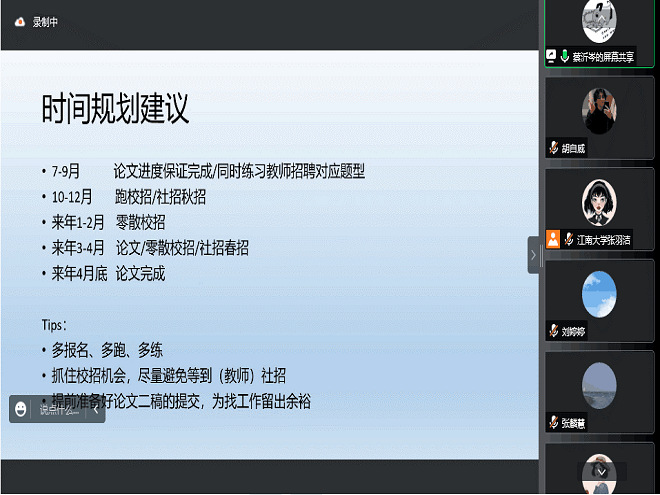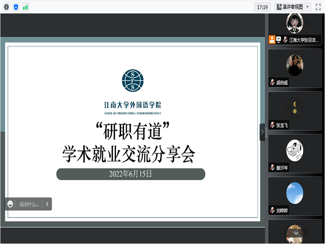2022年6月15日晚7点,开云手机登录入口“研途奋进”第九期活动在腾讯会议平台成功举办,本次活动主题为“研职有道”学术就业交流分享会。2021级全体硕士研究生及部分2019、2020级硕士研究生线上参与了本次活动。2022级拟录取同学也参与了本次分享会。四位2019级硕士研究生结合自己升学求职经历进行了分享。