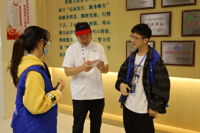 下午1时,青协志愿者在四食堂集合,为食堂的工作人员发放声音感谢信与暖手宝,表达对其日复一日辛勤工作的感激之情。声音感谢信上面附有二维码,由同学们的祝福音频压缩转码而成,扫描即可听取祝福。听到祝福后,食堂工作人员深表感动。