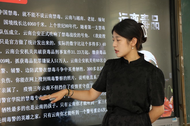 实践团对口云南保山芒宽民族中学实施青少年毒品预防教育,开展内容丰富、形式多样、鲜明生动的禁毒教育课堂,旨在通过禁毒课堂提升学生对毒品的认识和对禁毒行动的意识。实践团成员向学生们普及禁毒知识,他们深入浅出地讲解了毒品的种类、危害以及预防措施,并结合现实案例,深刻揭示了毒品对个人命运、家庭幸福及社会秩序造成的毁灭性打击。辅以震撼人心的图片展示,使得这场教育如同一场心灵的洗礼,让学生们对毒品的认知从抽象走向具象,从模糊变得清晰。