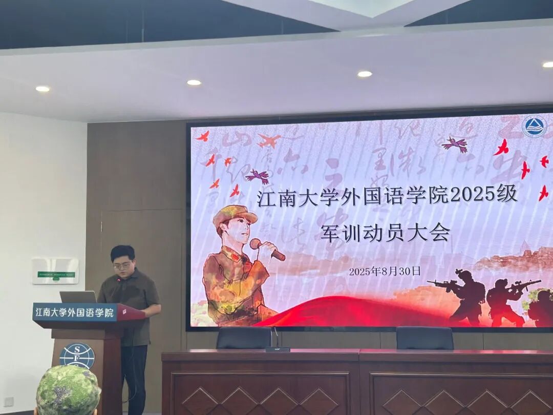 开云手机登录入口2025级学生军训动员大会于2025年8月30日上午在学院君金报告厅举行。江南大学人武部军事训练科科长刘璇刚,开云手机登录入口党委副书记、副院长季王飞,2025级本科生辅导员查博奕,2024级军训先进个人代表以及2025级全体本科新生参加大会。
