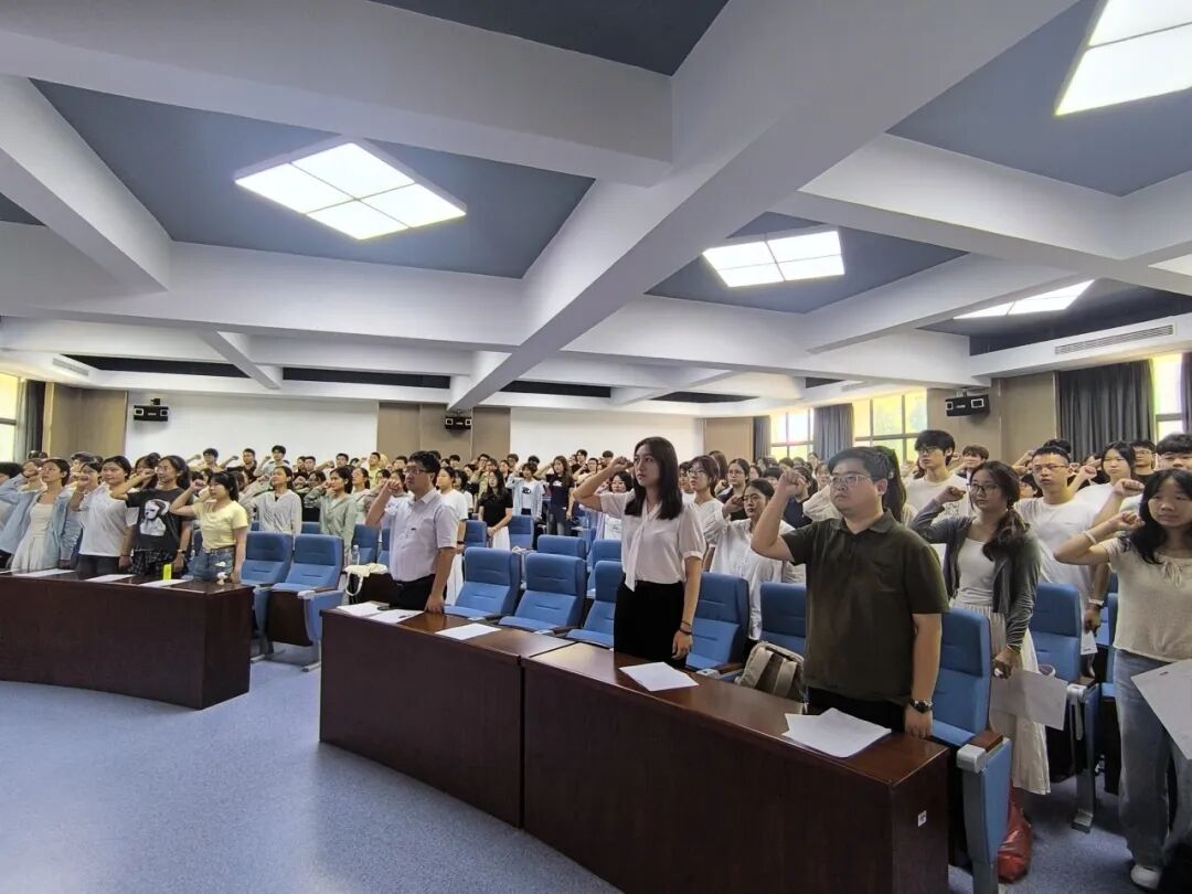 2024级军训先进个人代表朱怡萱向全体新生分享了她的军训心得与体会。她的经历告诉我们汗水浇灌成长,坚持收获硕果。2025级本科新生代表刘恩齐分享了她对于军训的认知和决心。她的话语充满了对军训的期待和挑战自我的勇气,代表了全体新同学的心声,更展现了2025级新生的良好精神风貌。最后,朱怡萱带领全体参训学生庄严宣誓,大会圆满结束。