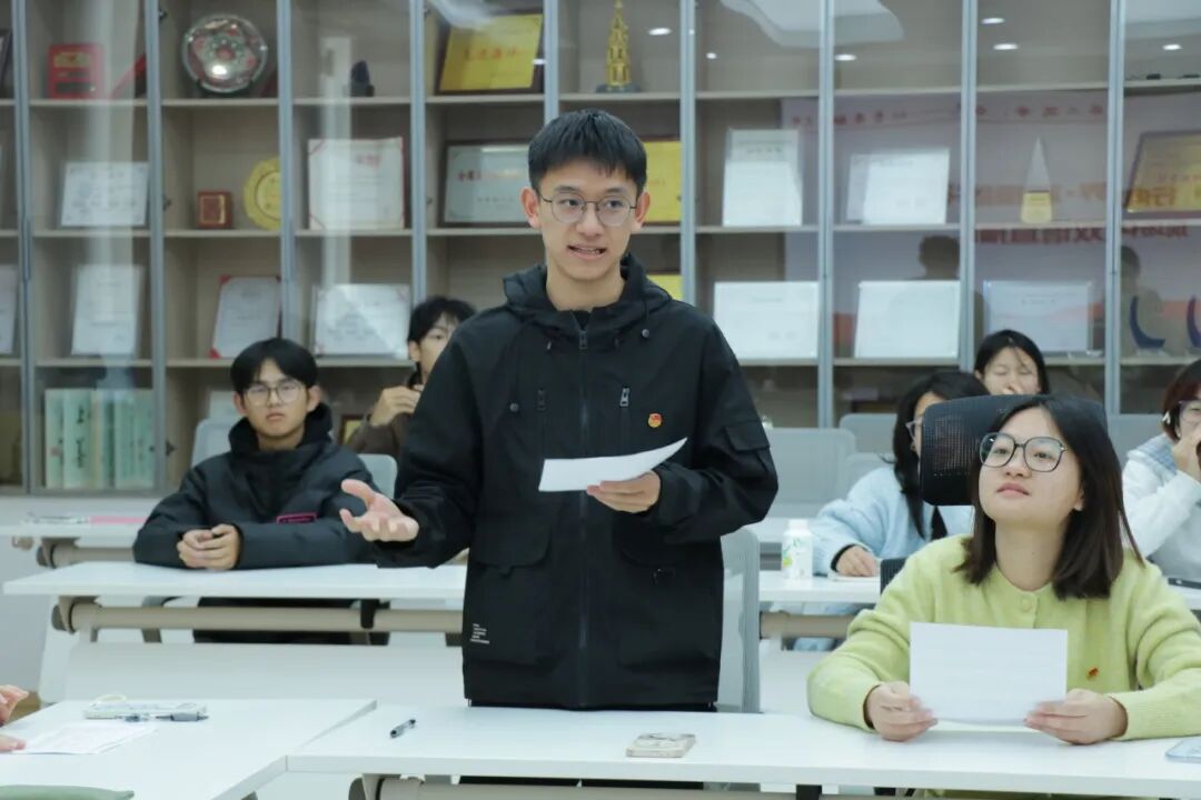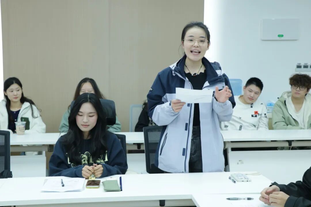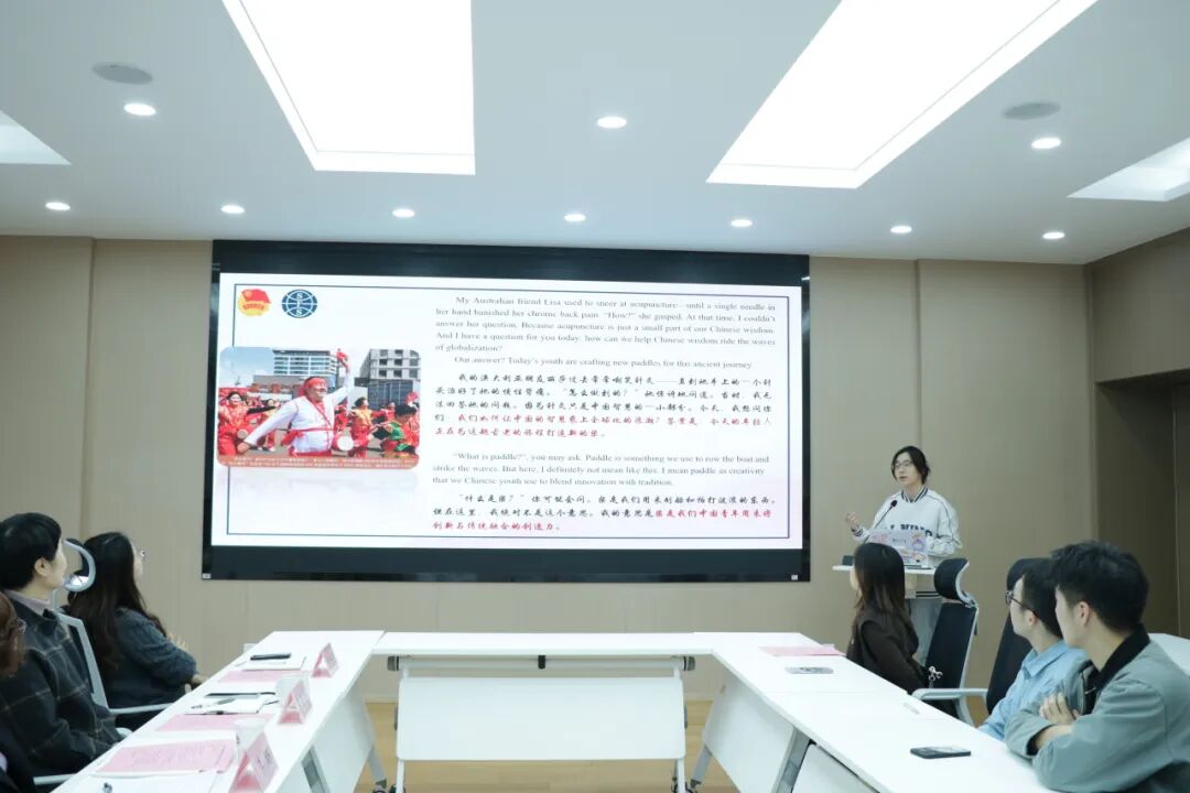 朱彤围绕“十五五”规划有关高水平对外开放等重点内容开展主题学习,引导同学们深化对外语专业服务国家战略的理解,强化以语言服务时代、以专业贡献社会的责任担当。鲍润怡同学带来题为:Striking the Waves: Chinese Wisdom’s Global Voyage的英文演讲。她以中国针灸走向世界为例,以专业素养展现出外语青年面向世界的开放姿态。“语翼赋农”实践团队长杨炎学带领同学们现场开展双语直播助农模拟展示,通过中英双语介绍农产品、模拟乡村产品推介,以真实场景呈现外语学习在推动乡村产业发展中的实践价值和具体应用。沙亦桐同学、高赵一涵同学分别围绕“双语助农直播”“跨文化交流项目”做经验分享,沙亦桐介绍了团队在直播调研、传播与交流等方面的主要做法与实践成效,高赵一涵则从多方面总结外语学子在多元文化环境中的学习成果与实践收获。