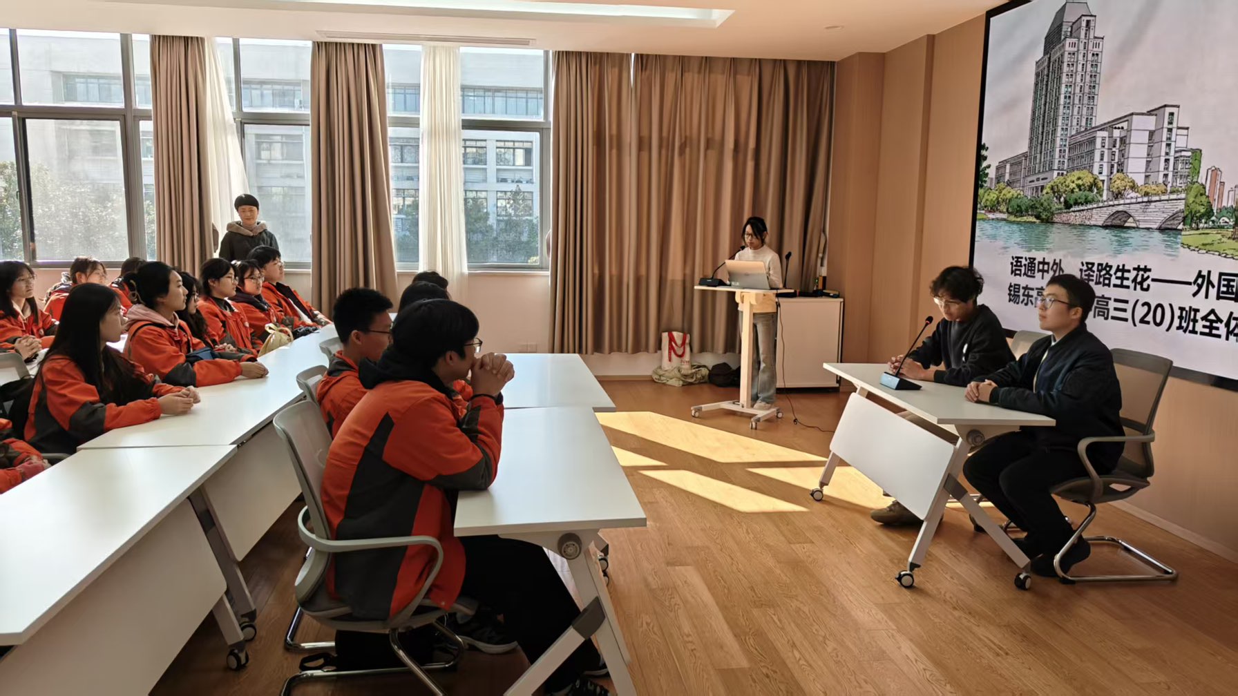 暖场环节,学院口译社的三位同学进行了精彩的交替传译展示,以沉浸式体验让同学们近距离感受语言学科的魅力。
