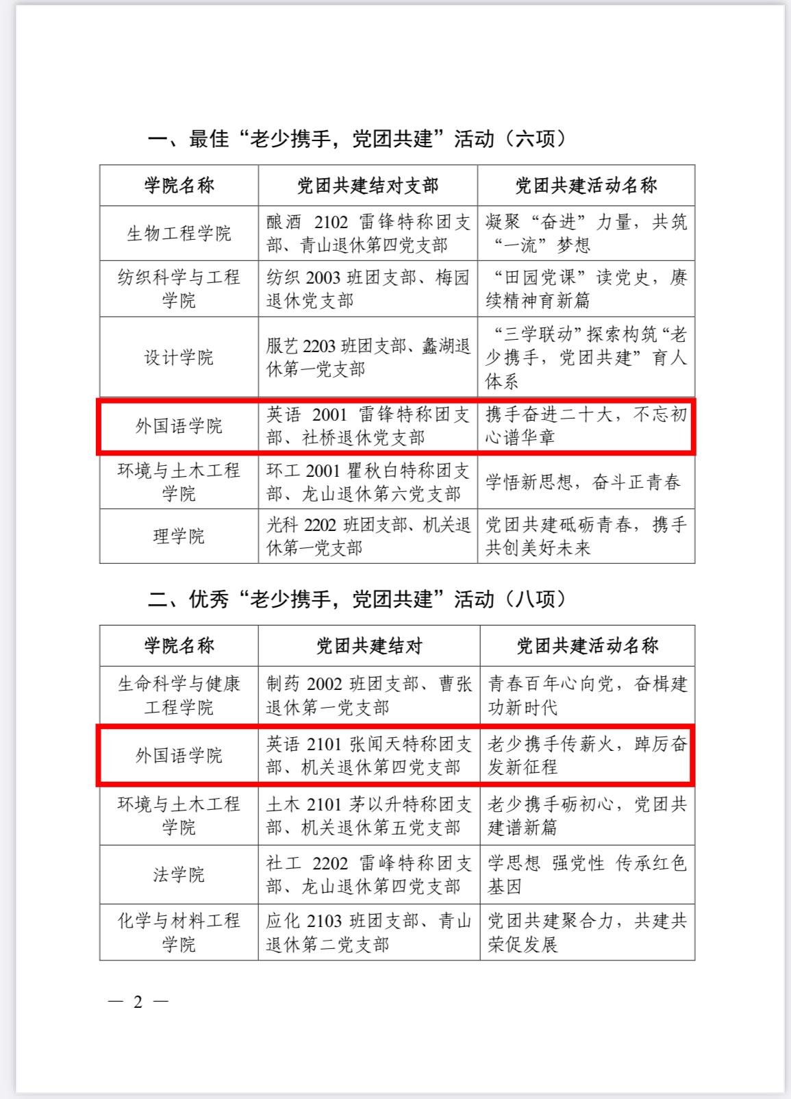 近日,学校党委公布了《关于表彰 2022—2023 年度“最佳‘老少携手,党团共建’活动”的决定》,经专家组评审、校关工委主任会议研究,并报学校党委同意,开云手机登录入口报送的两项活动均获表彰。社桥退休党支部与英语2001团支部组织申报的活动荣获“最佳党团共建活动”(全校共六项),机关退休第四党支部与英语2101团支部组织申报的活动荣获“优秀党团共建活动”(全校共八项)。